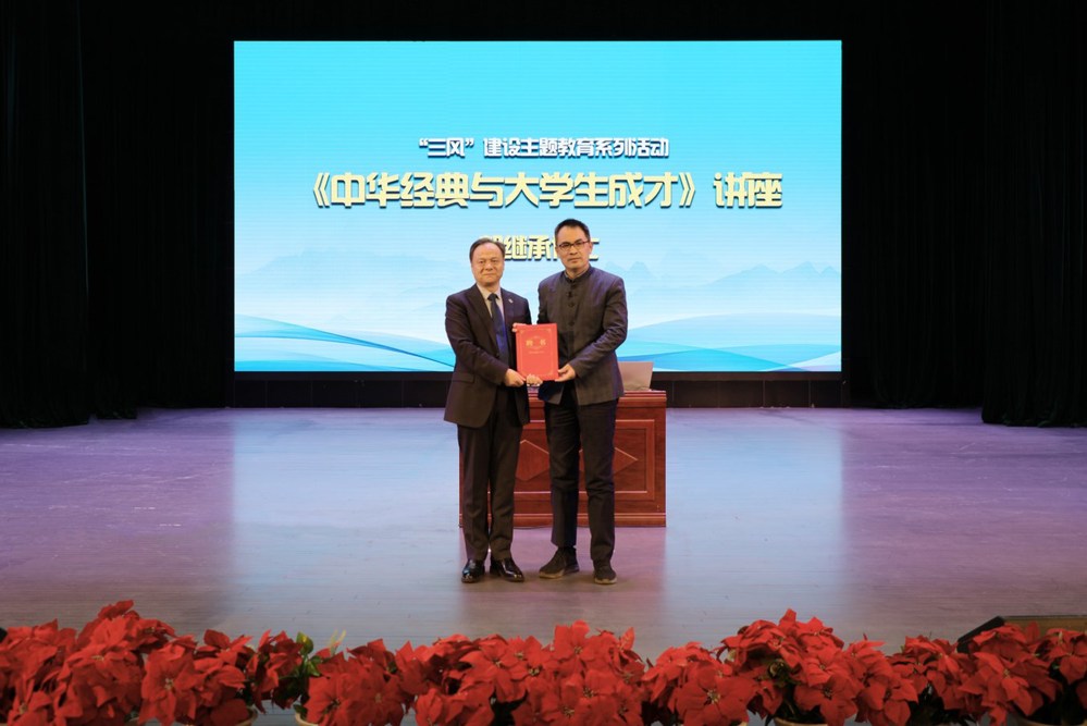 为扎实推进学校“三风”建设主题教育活动深入开展,推动广大师生员工更新观念、提升能力、转变作风,4月3日,我校邀请中国政法大学副教授、北京师范大学哲学博士、著名学者郭继承在音乐厅作题为《中华经典与大学生成才》的讲座。校长于长福出席讲座并为郭继承博士颁发客座教授聘书,党委副书记李怡主持讲座。