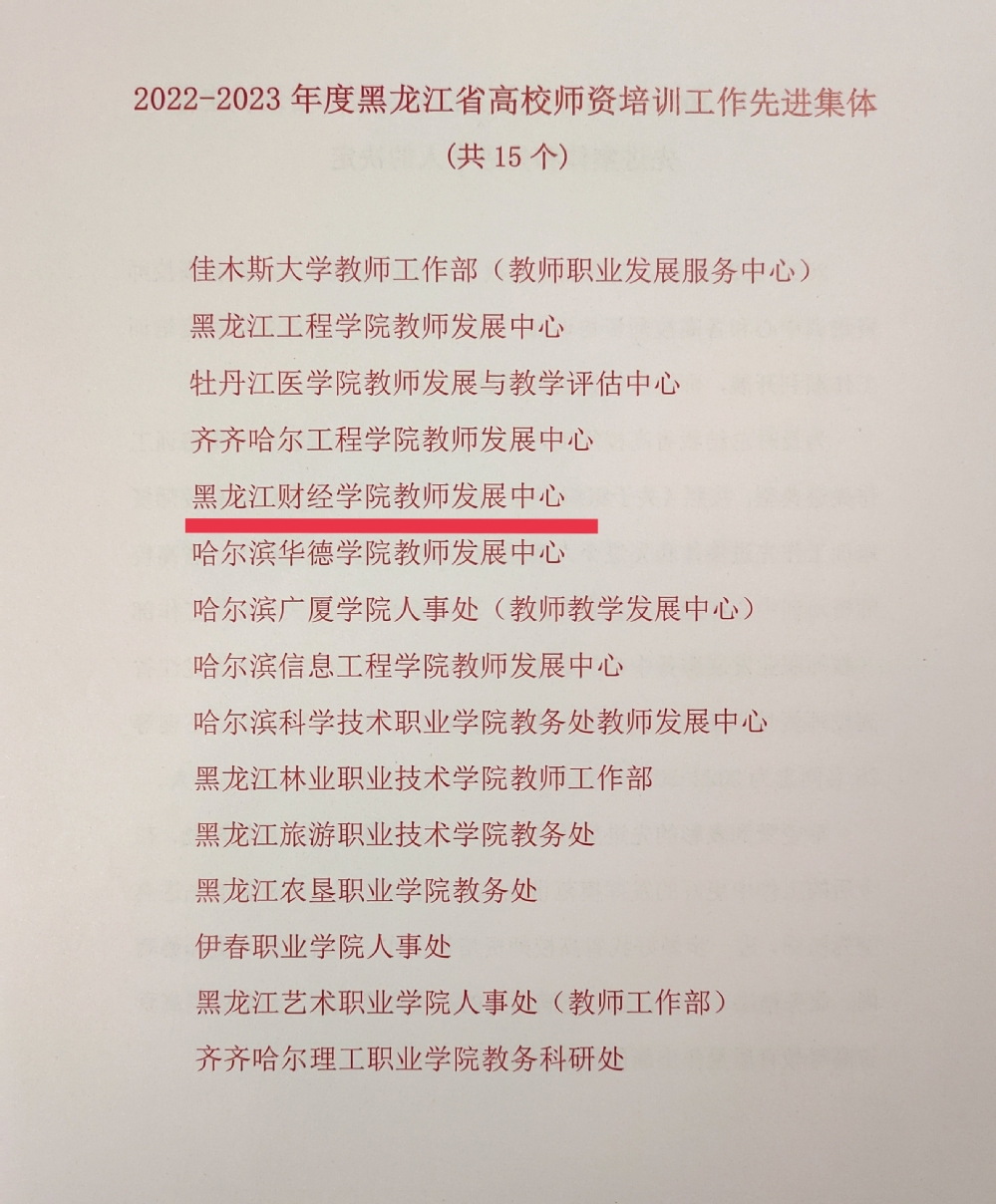 2023年10月28日至31日,黑龙江省高校师资培训工作总结表彰会暨第九期黑龙江省高校教师培训者培训班在四川师范大学举办,会议对2022-2023年度全省高校师资培训工作先进集体和先进个人进行表彰,全省共评选出师资培训工作先进集体15个。我校已连续两届荣获“黑龙江省高校师资培训工作先进集体”荣誉称号。