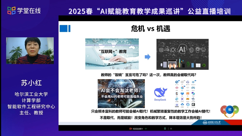 根据省教育厅要求,为深化我校教师对人工智能教育应用的理解,推动课堂教学模式创新,我校于2月18日——3月18日举办“AI赋能高等教育教学改革”系列专题培训。全校教师和部分管理人员共计500多人通过“线上直播+回放”的形式完成了此次网络培训。