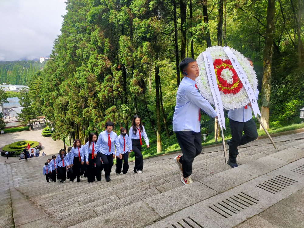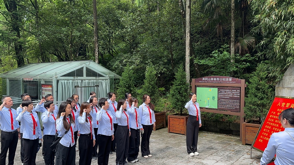 在井冈山烈士陵园,全体学员向革命烈士纪念碑敬献花圈、鞠躬默哀,表达对革命先烈的无限崇敬与哀思,全体党员面向党旗面前,举起右手重温入党誓词,铭记入党初心,“我志愿加入中国共产党......为共产主义奋斗终身!”宣誓声在山谷间久久回荡。